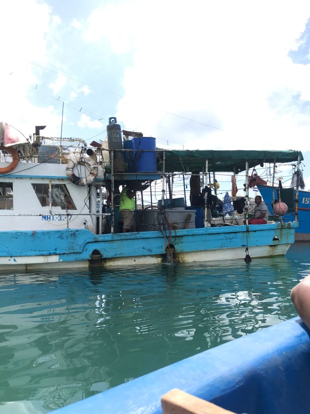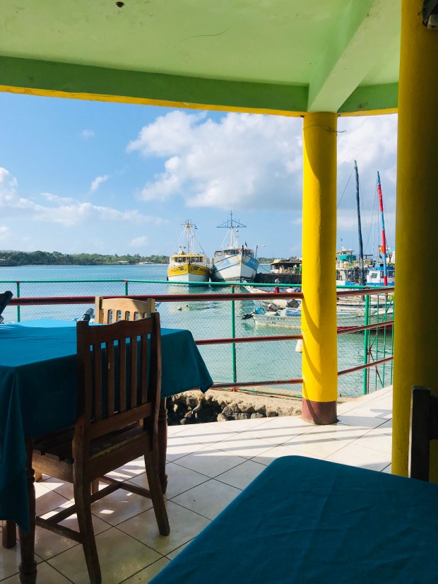 Early alarm at 4:30, on time shuttle to the airport. Had to ask where La Costena airlines were. Just a little ways away. Stood in line, got a ticket, waited for the plane and then we were off in a small plane. A quick 90 min flight. We had to check luggage, so I was a little worried about not getting my bag. I had changed a few things from my carryon to and from my main bag, especially contact lens. Drove with Marlon, the Namath Jersey wearing native. He charged me a dollar to take me to the ferry. Tickets get sold at 8:30, so after I bought one, I went next door to the Fisher Restaurant. Lots of activity at the wharf. Fishermen coming in, people transporting goods to different islands etc. it is a beautiful day, warm but not too hot.