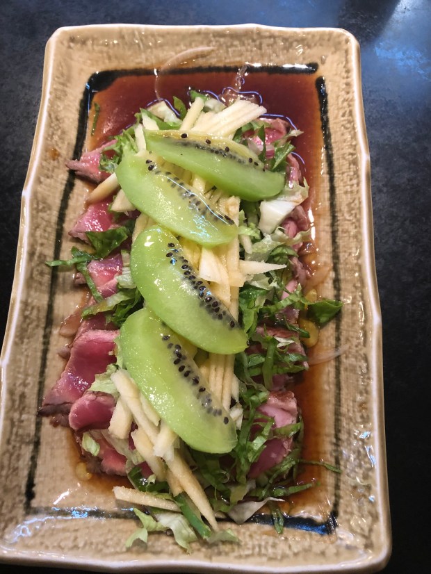 I am an adventurer. Today when it was raining, I put my rain gear on and walked a couple miles to town for dinner. A tourist would stay in or call a cab. I went to Hana Sushi bar. Had some great food. It was busy because of Fathers Day. Had some rare beef with julienned apples and ponzu. Amazing!