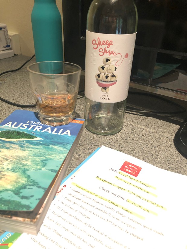 The roads were two way, on the wrong side of the road. She likes to drive and I like to navigate so it works for us. The drive was beautiful, jungle meets water, Rainforest meets reef. Finally we saw a “Bottle shop” and the clerks couldn’t have been funnier or friendlier. They helped us with our purchases, wine and New Zealand vodka and soda.