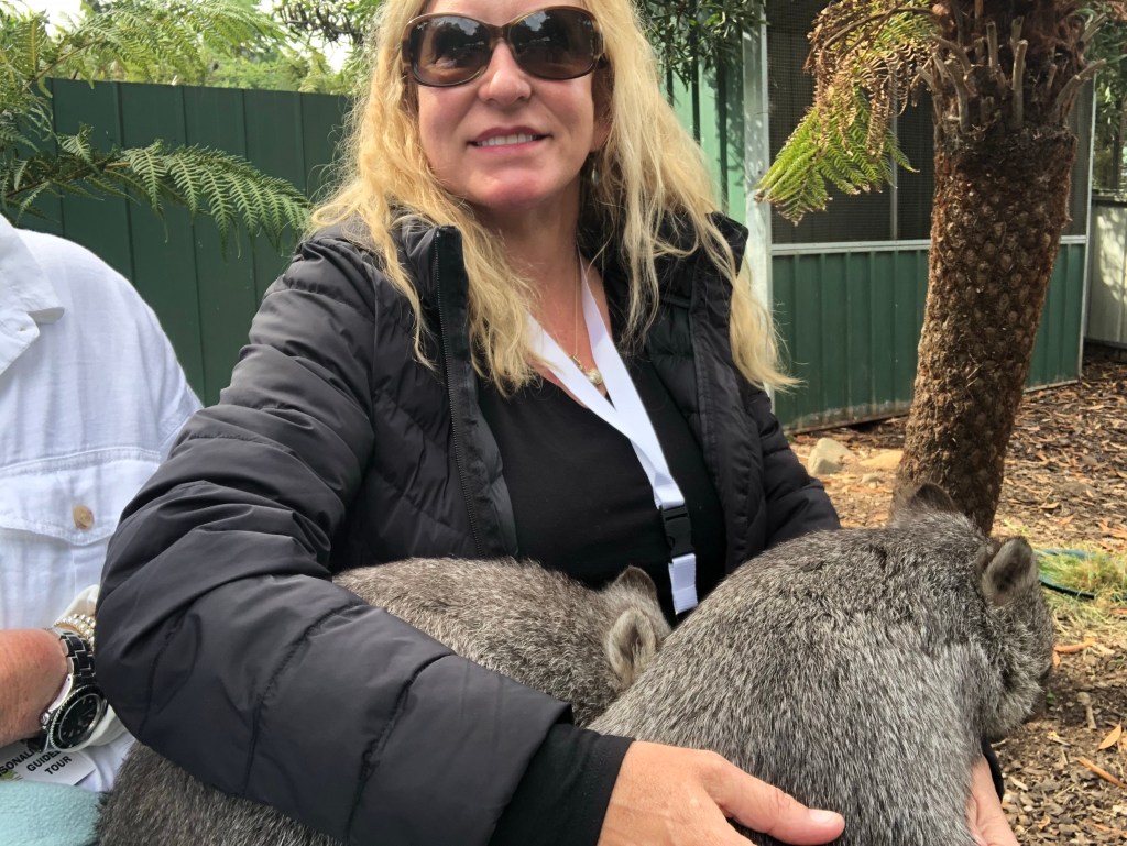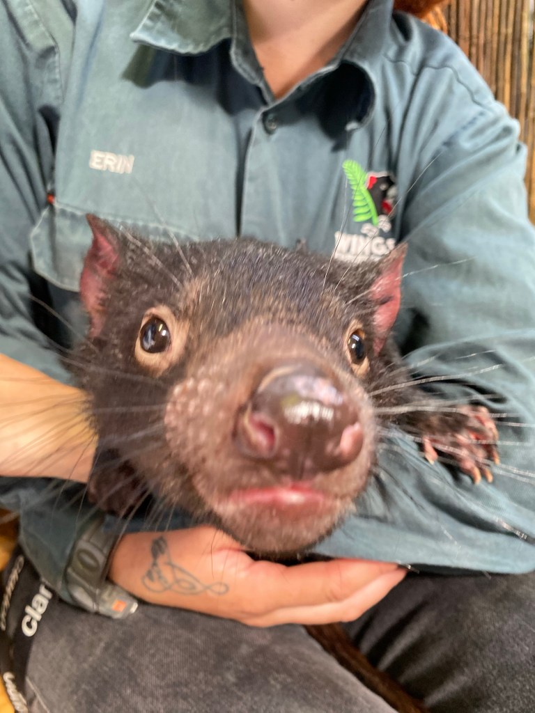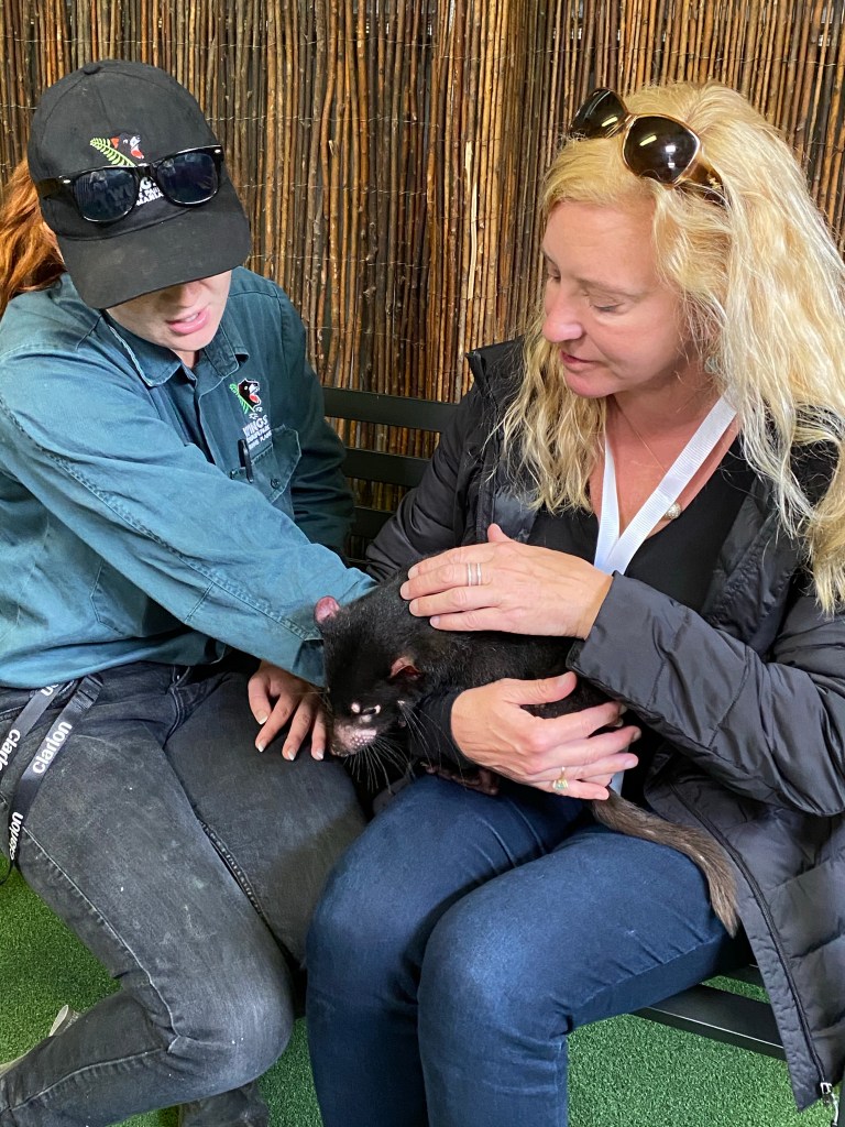 Finally a shower for me. It wasn’t as cold as I thought it would be. We packed up everything and waited for the animal encounters. First we went through several of the inside enclosures, the are a lot of rat, opposing looking animals here. First one we held was George a baby Tasmanian devil. He was very sweet. Apparently they have the devil name because when they came out at night before electricity, the candles of the early settles made their ears look red and their teeth were big and sharp. They called open their mouths to 180 degrees. That is a big bite.