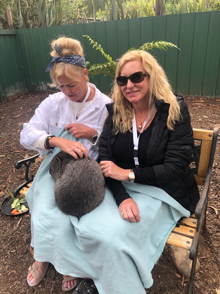 Next we went to the Wombat pen. There were three wombats. They were super friendly. We held one on our lap and the other two kept climbing up.