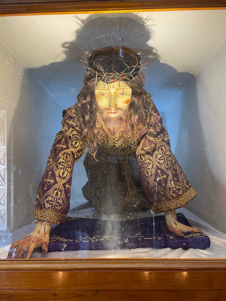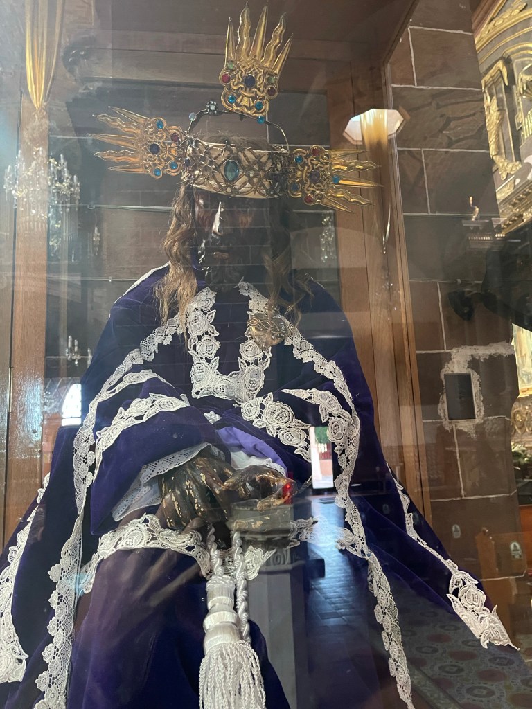Churches always intrigue me. So many unusual relics, some spiritual. I remember seeing a pair of blue gloves that wept tears of the Virgin Mary in Jordan. Relics of the Holy Grail, relics of Jesus’s cross. The statues here had from the looks of it human hair!