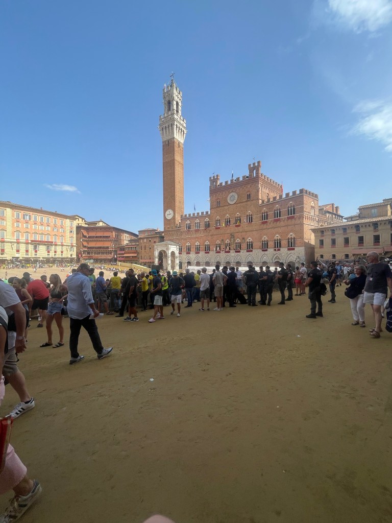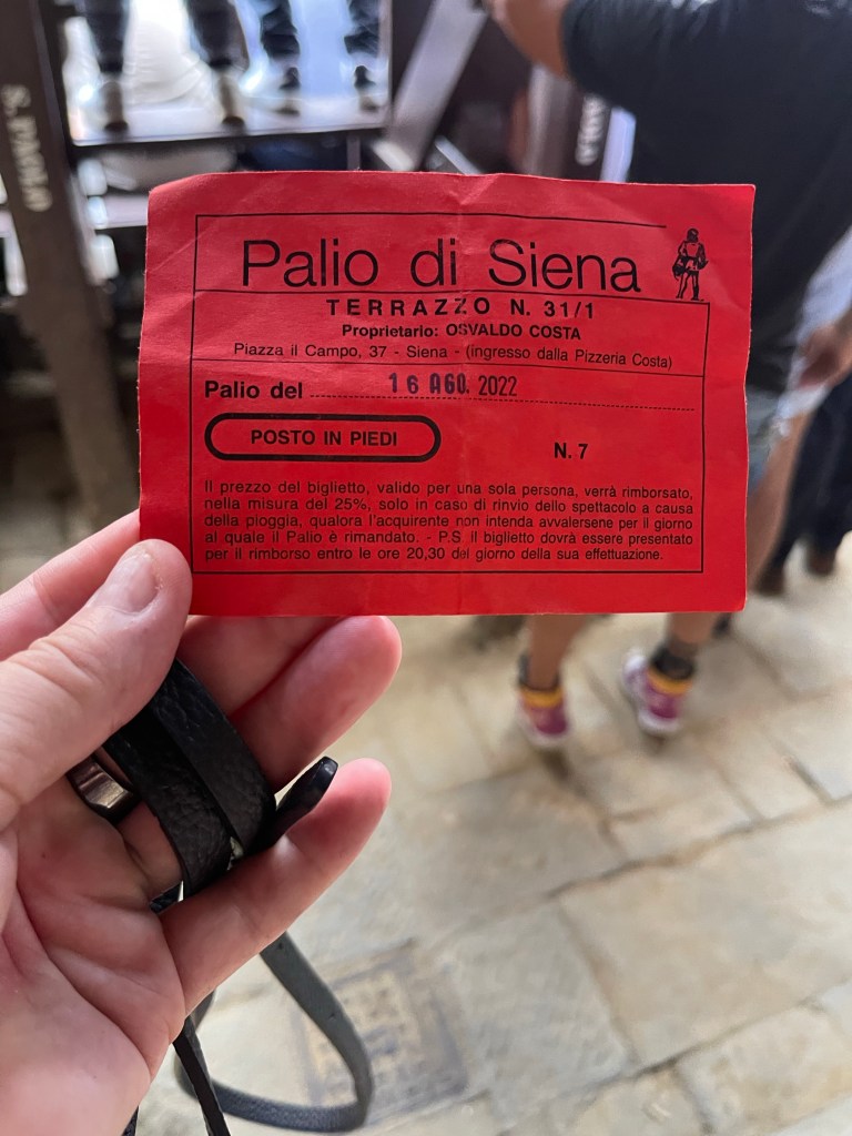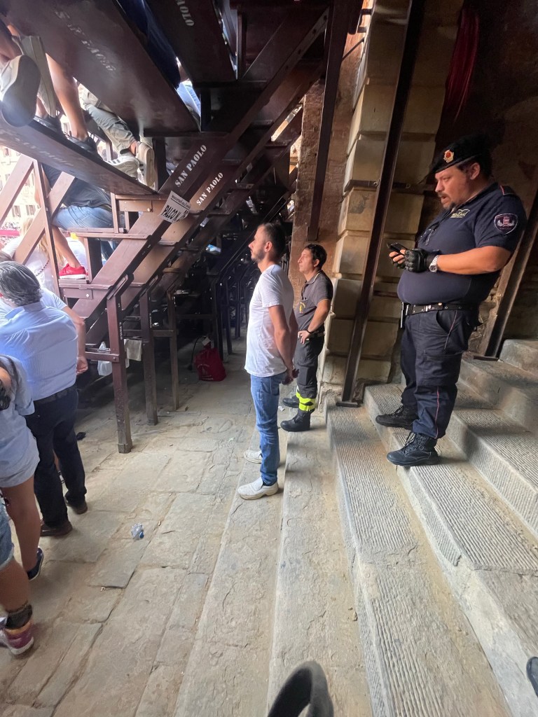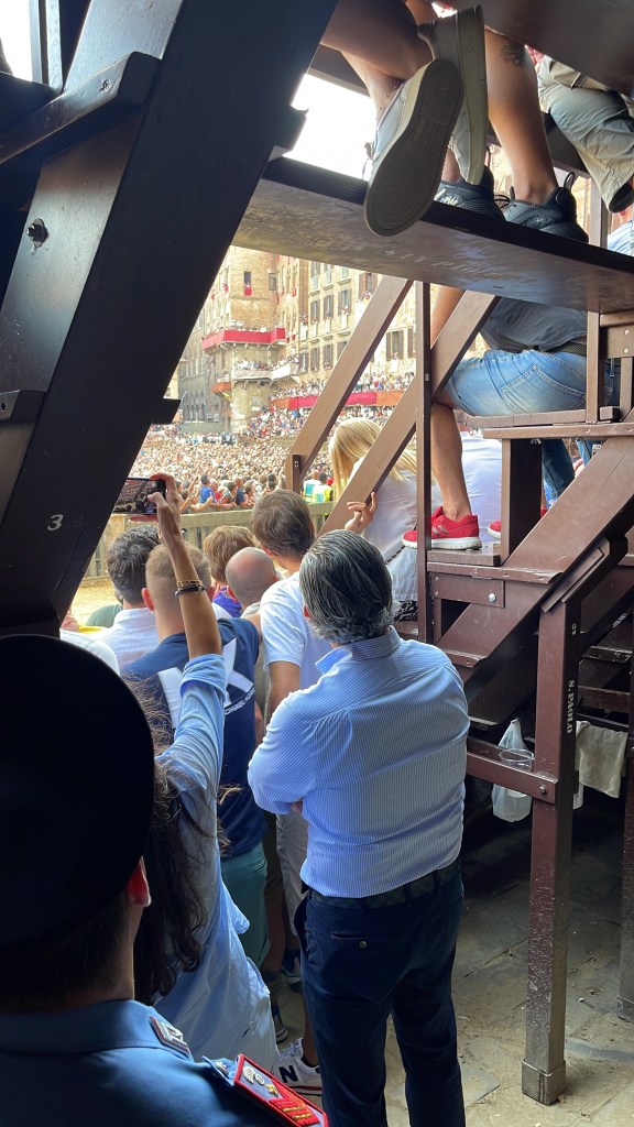 After a short nap and a nice message from my host that the race would start earlier than the day before, I headed back to Il Campo. Same bar. They had a table reserved and they didn’t care that it was just me. After a few minutes the people next to me asked if I had been there the two days before. They were part of the bachelor party that we talked to! They asked where the rest of my group was and I told them that they had to get back home, then they asked if I would like a ticket? Yes!!! They had seats near the bar. Of course I bought them a round of drinks. They didn’t know the race was starting earlier than the day before so we got ready to find the seats. We raced back and forth under the bleachers but we were too late to get to the seats. I left them and tried to peak through here: