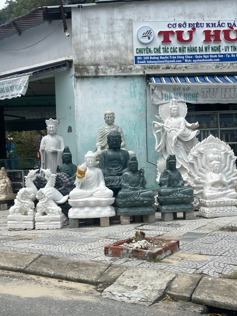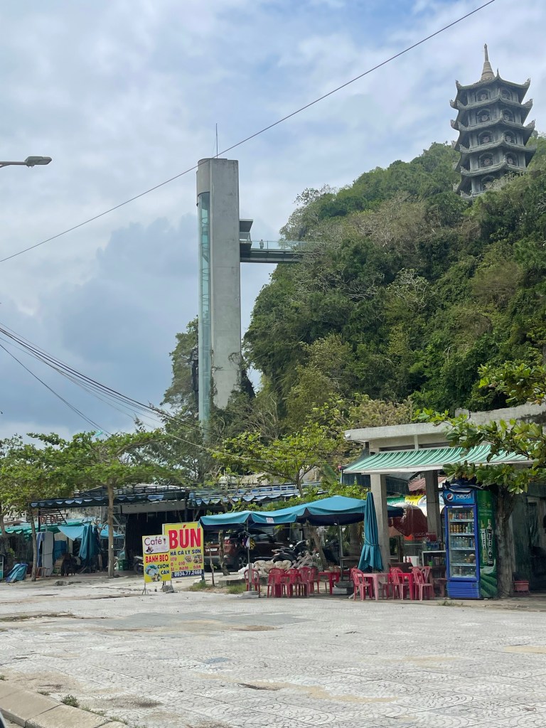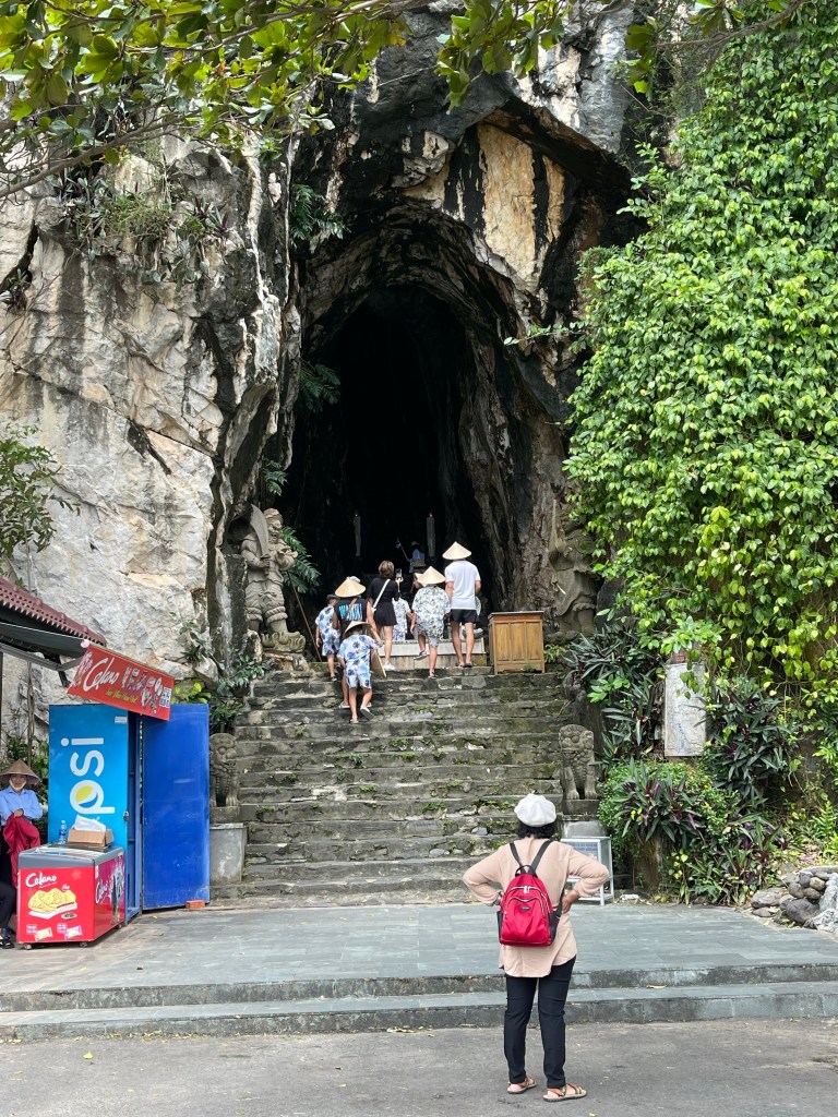 We packed up after the tailor left. And our taxi guy arrived on time. Again we booked tickets for flight but so don’t seem to be getting all of my emails. Do Ai wanted to be at the airport a little early. On the ride to the airport we drove by Marble Mountain. There was one of the tall like seven story pagodas and a shrine on the mountain. Our driver asked if we wanted to see it. He thought we had time. We drove to the entrance which was a staircase carved into the marble. We wanted to go to the top, there was even a elevator on the outside of the mountain, but we would have to leave our backpacks in the car. It was a hard decision but safer was better than sorry.