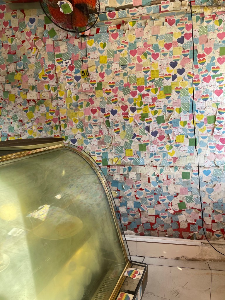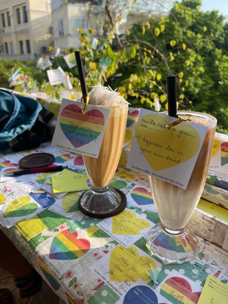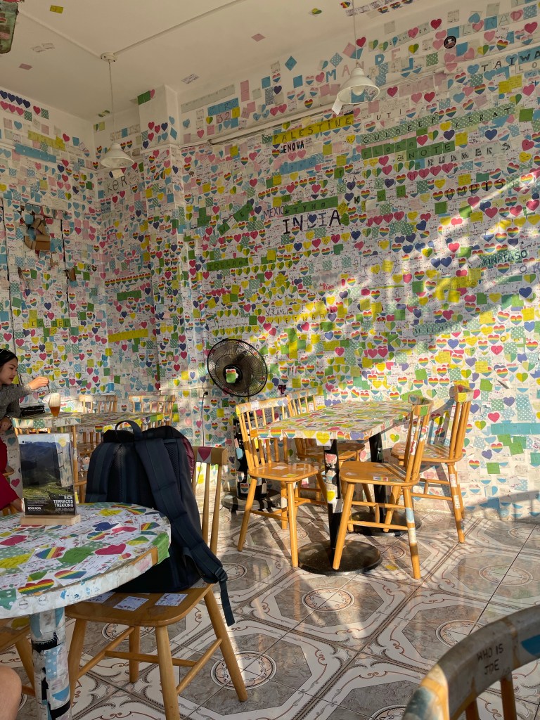 Now we are at a cute coffee shop called The Note Coffee. There are sticky notes everywhere and you get a message on your coffee and leave messages