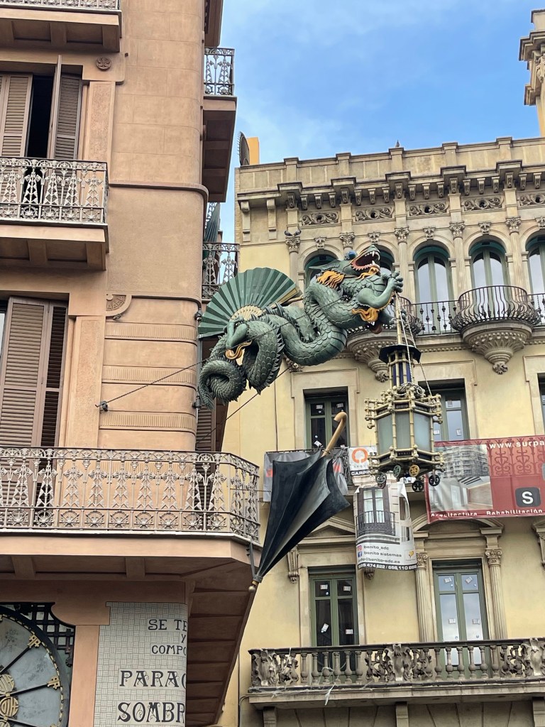 That is one weird gargoyle/dragon with the umbrella ….strange art sculpture.