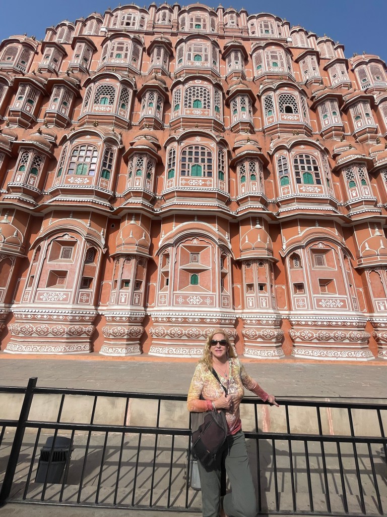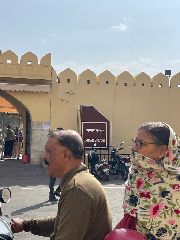 I went to the little bar for food and a cocktail. A whiskey drink and curry with watermelon salad. The feta on the salad was frozen or freeze dried. The shrimp in the curry was way overcooked but the flavor was fine. It was a long day. Shower and bed. In the morning I decided to try a tour. The hotel had a driver and guide and I gave them a list of things I wanted to see. Typically I would have walked to these places or at least started at one but I wanted to see a lot of things today. Tour stared out good. The guides’ English was hard to understand but good enough. The driver was very aggressive. We started with the famous Hawa Mahal with its facade to let the ladies see who was coming into the palace without being seen 365 windows.
