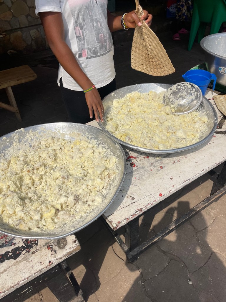 Time for lunch. I decided on local food. The white stuff is yam. They take large sticks and pound it until it resembles dough. Then you use you left hand to scoop it up and dip it into the soup. Was good at first. Washed it down with a local lager.