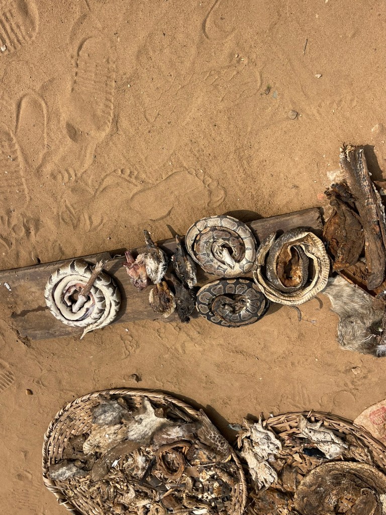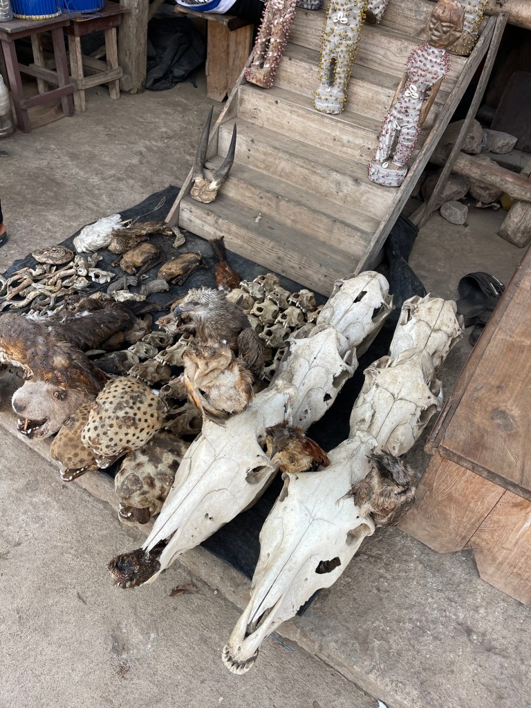 A person who is sick comes to the market for a reading by a priest. He determines if a spiritual or disease problem. If disease, they are sent to the hospital. If spiritual the priest will use dead animals and herbs for a cure. It was fascinating. And very smelly. Snakes, monkey heads, parrots etc.