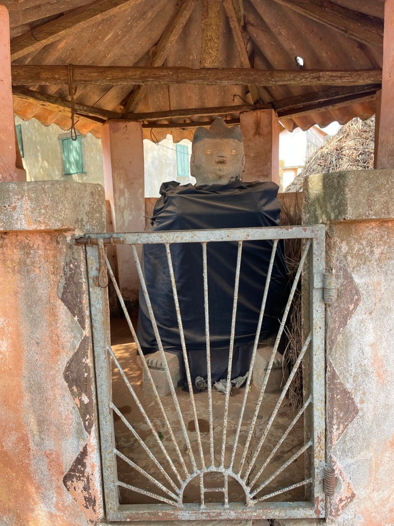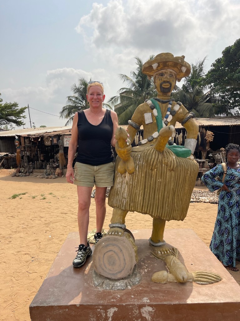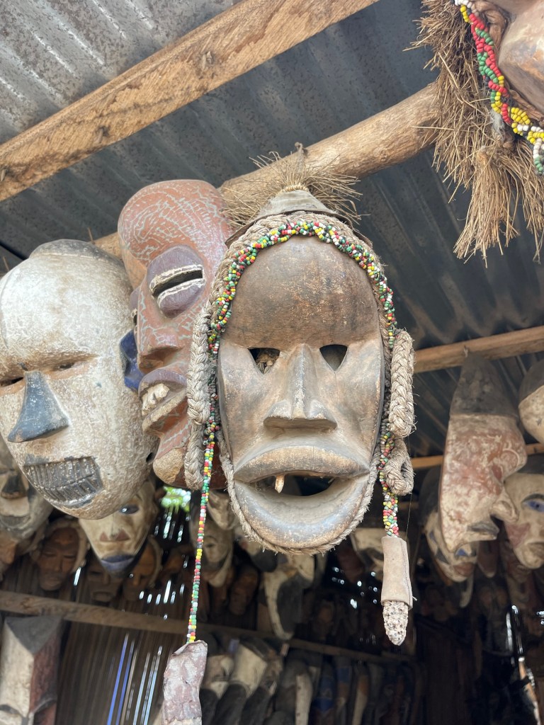 We drove about 30 minutes and down and around some dirt roads and landed at a Slave House. This area a structure was 150 meters from the ocean during the 22 years that Africans were kidnapped and forced into slavery. The house was simple, four rooms at each corner and a center room. The would be slaves would have to wriggle under the house to their holding cell and then they were kept in dark, cramped quarters for several weeks. The area was about 4 feet tall, again no latrines, no clothing and chained together. There was a hatch in the center room where food was thrown down. The guide wanted me to go check it out. I politely said no. As always I could buy all sorts of souvenirs.