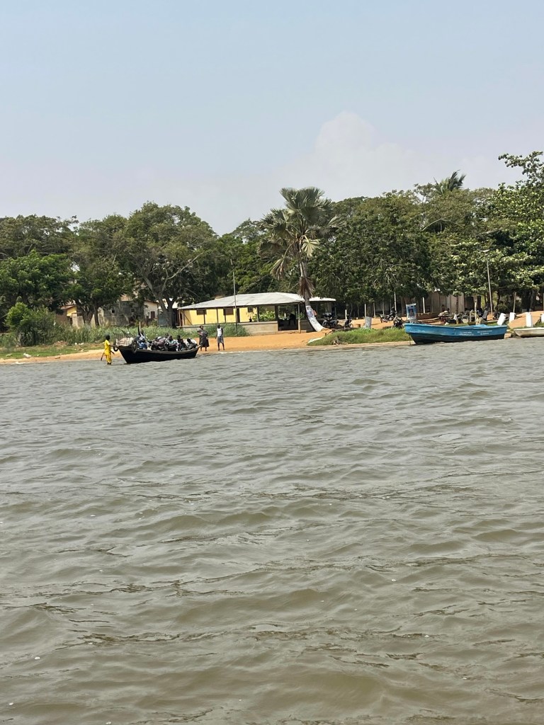A few miles away we came upon a lake, there were canoes, one was waiting for us. A little confusion of if I take my socks and shoes off or walk in the water. Yup take the shoes off and wade into the muddy water and get into the boat. Someone rowed a bit because it was shallow, then a Mercury motor (from my hometown of Fond du Lac Wisconsin) motored us across. There were several beautifully dressed ladies and babies on the boat. Most people ignore me but one cute little boy kept staring. He would not smile! There were also two motor bikes on the canoe.