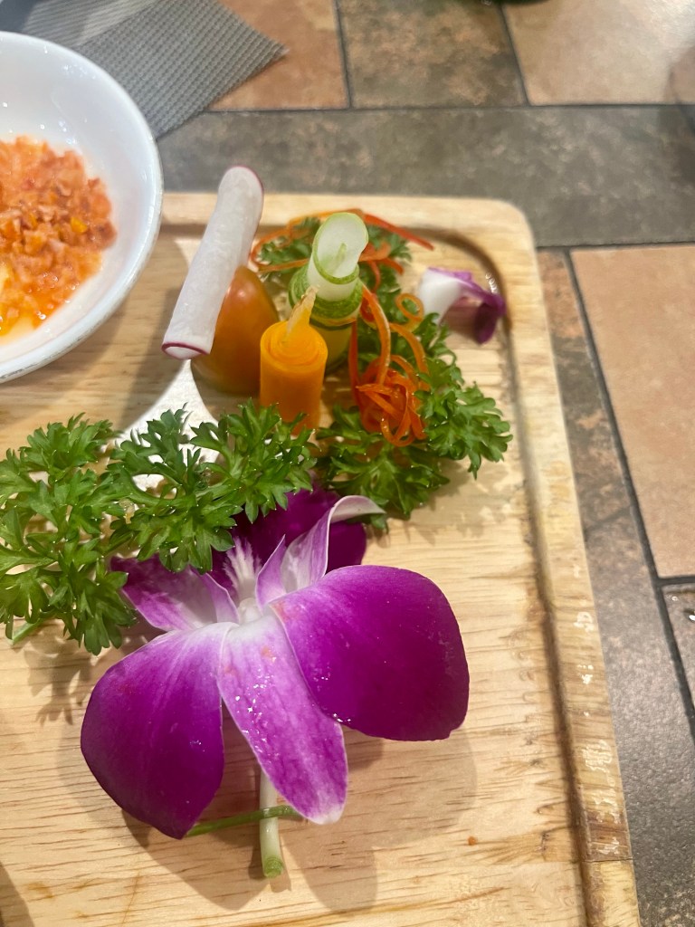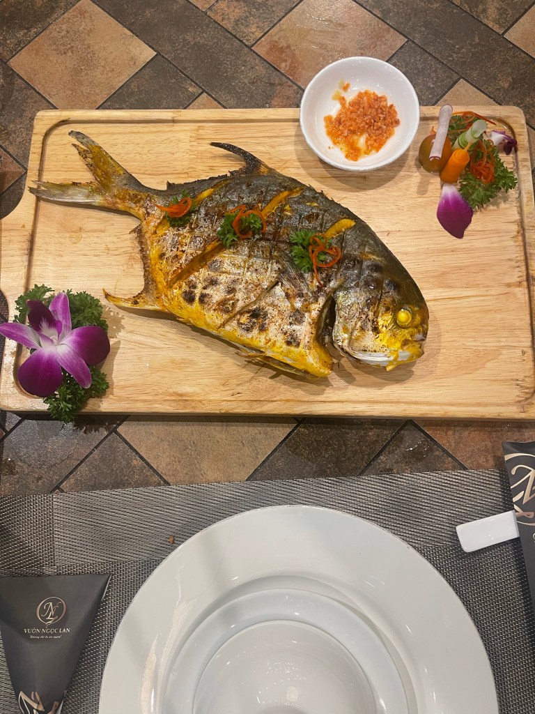 The city of Cat Ba is small, lots of seafood restaurants and tour companies. One ATM in town. Chose the Big Man Restaurant and has a passion fruit mojito. We ordered Pho and pork Skewers and king mushrooms deep fried. The cute server came up after we got the mojito and admitted that there was no alcohol in it! We didn’t even notice! The skewers came with translucent paper. It was rice paper to wrap around the pork with lettuce and dip in the sauce.